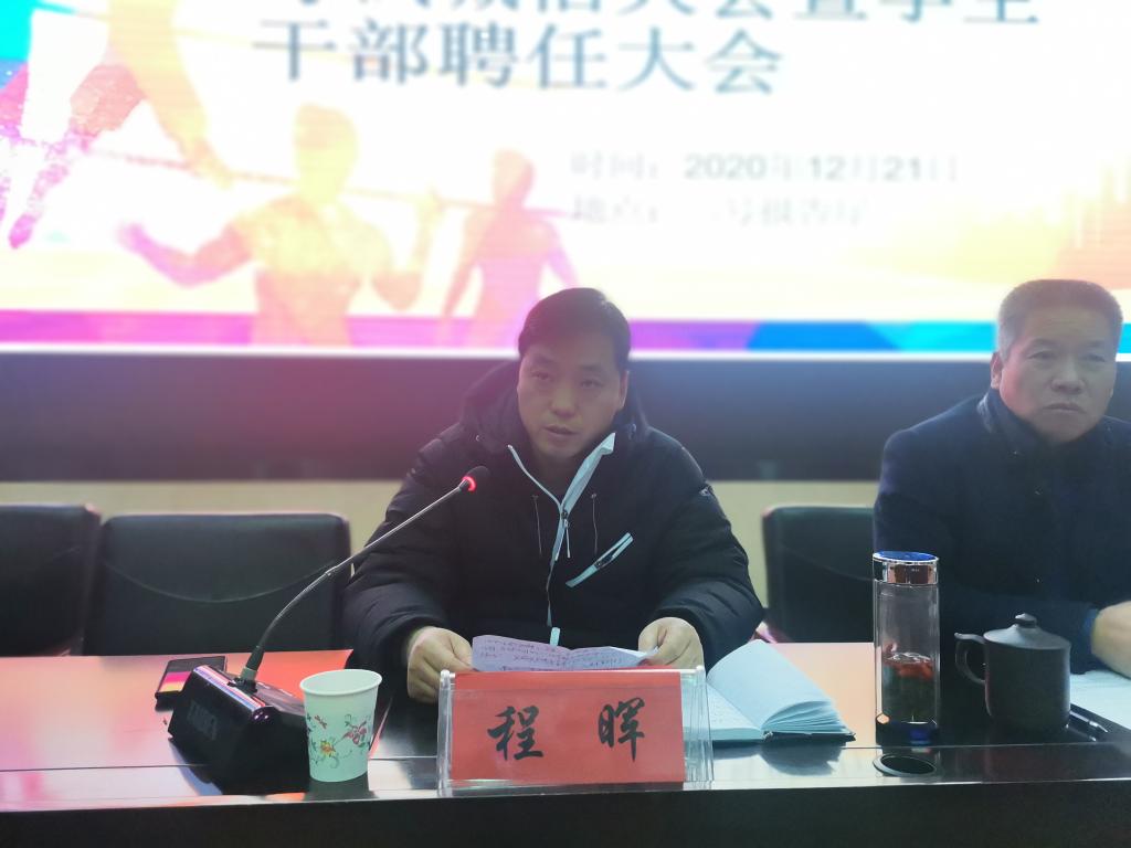 12月21日晚,体育学院在二号报告厅召开考试诚信教育大会暨学生干部聘任大会,学院党政领导班子,各教学系(部)主任,辅导员,19级、20级各班班主任,20级全体学生,以及19级、18级、17级各班学生代表共计370多人参加。大会由学院团委书记王昊支持。