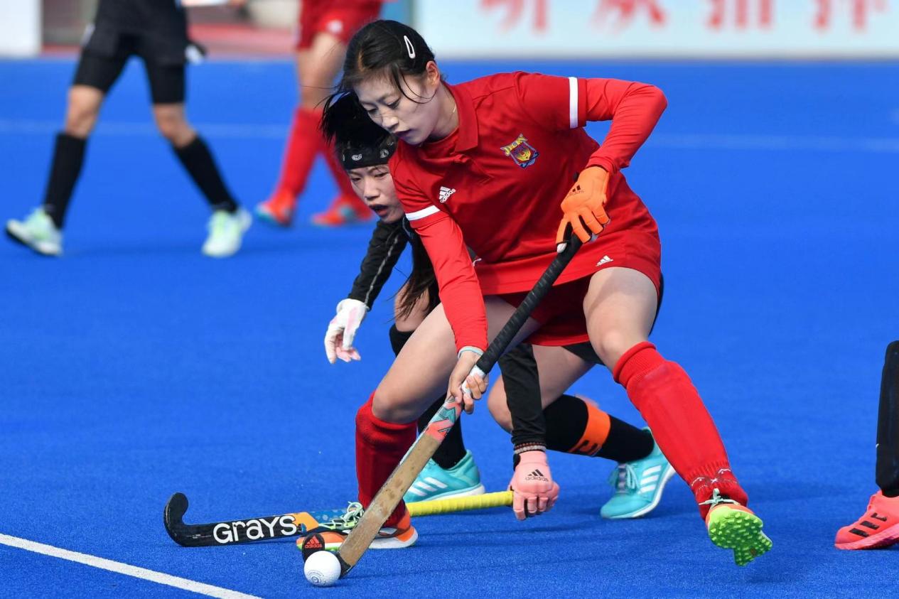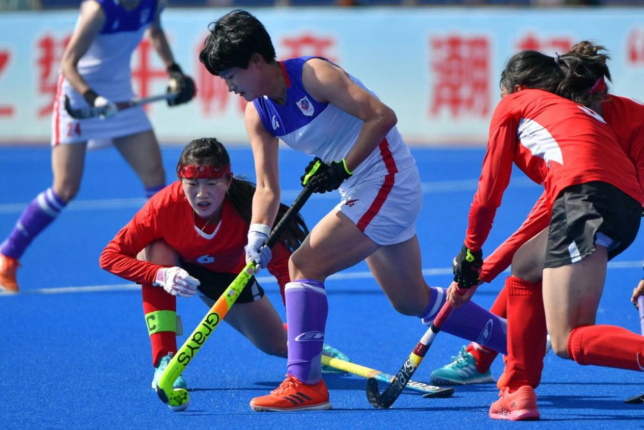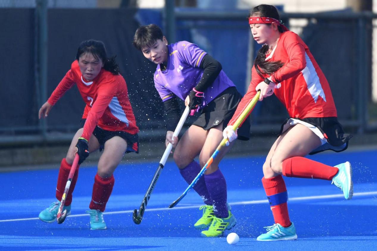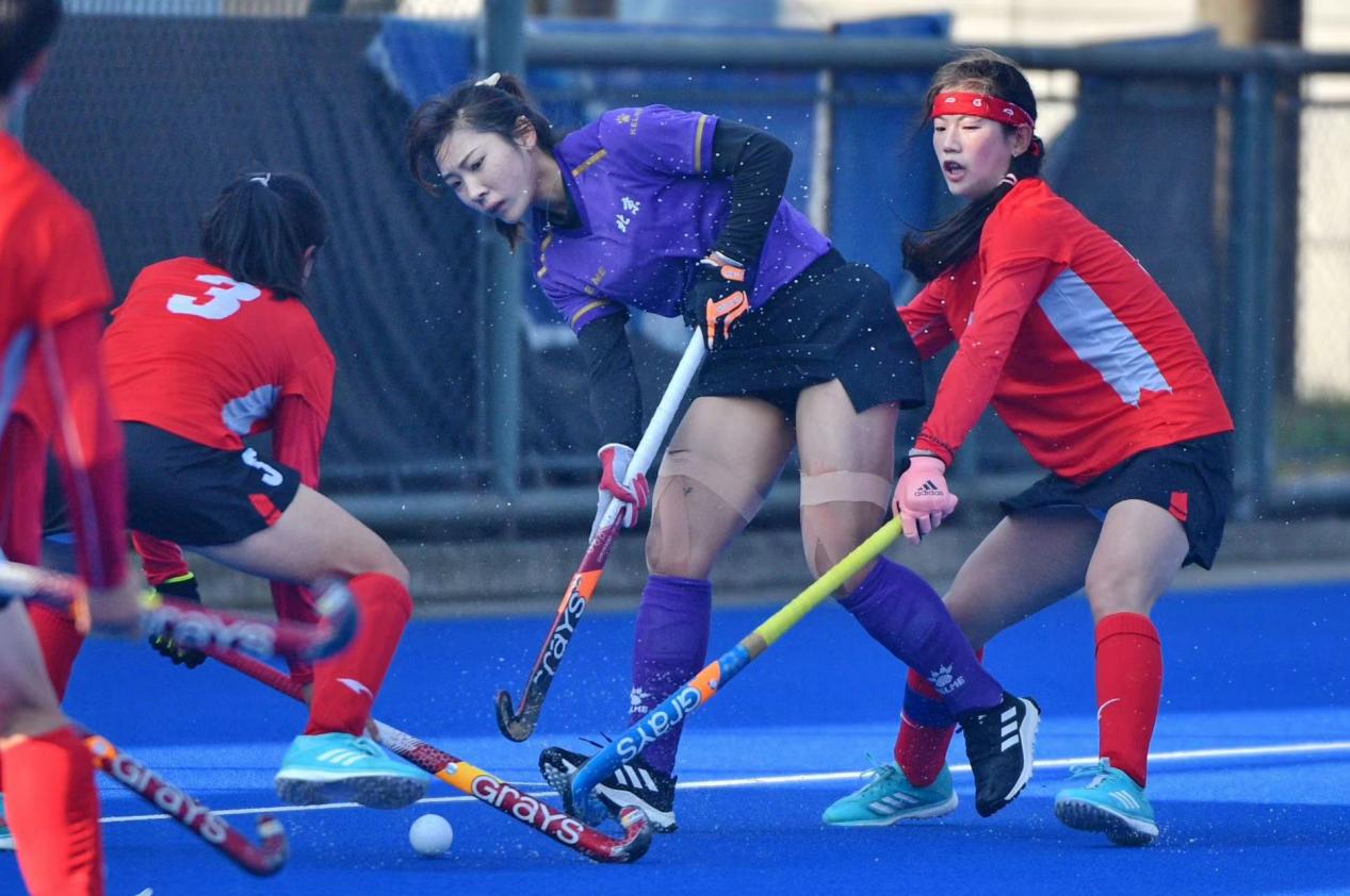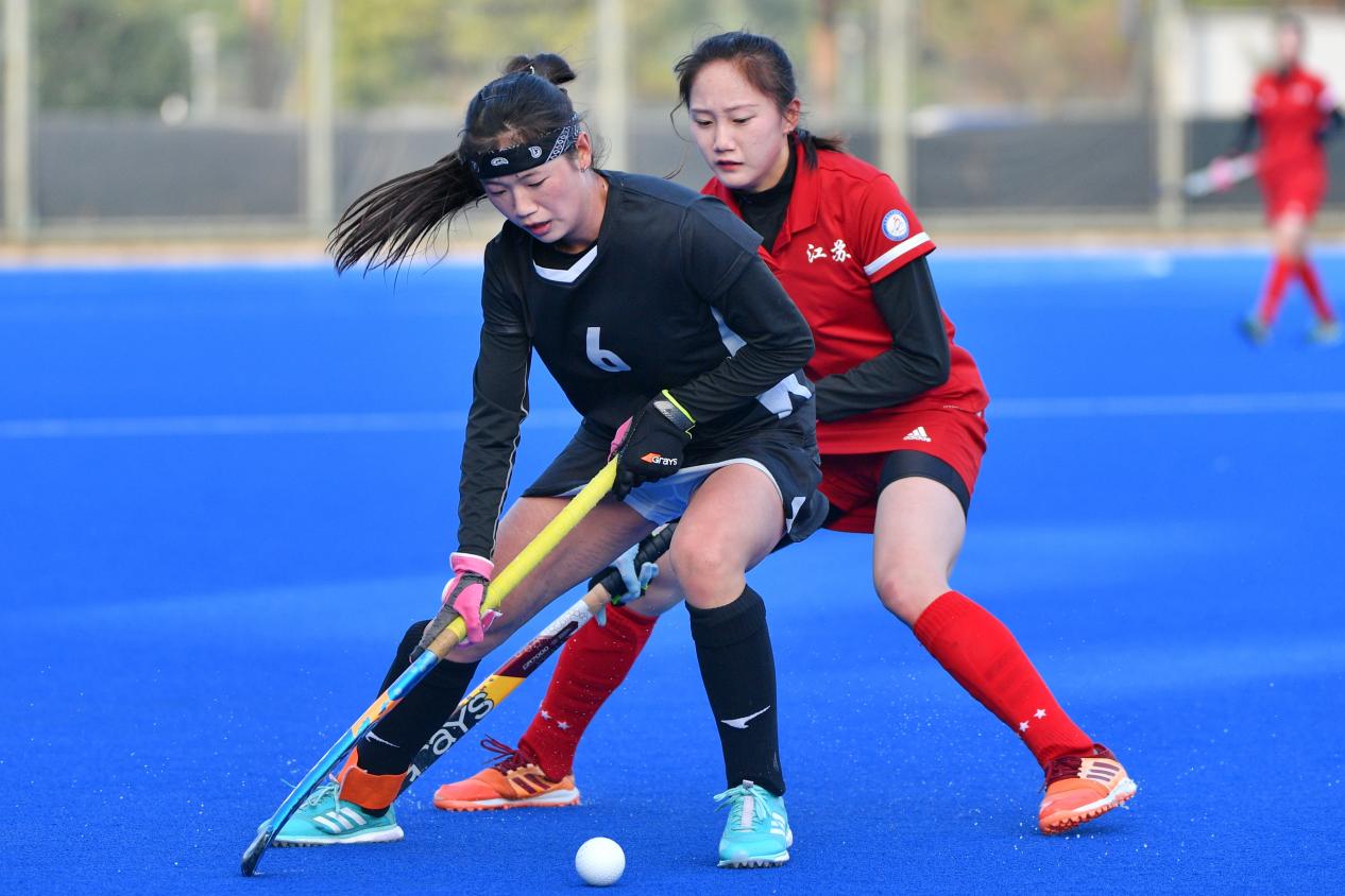 2022年在江苏常州全国青年女子曲棍球锦标赛中甘肃队袁明杰(左一)与江苏队队员在比赛中拼抢