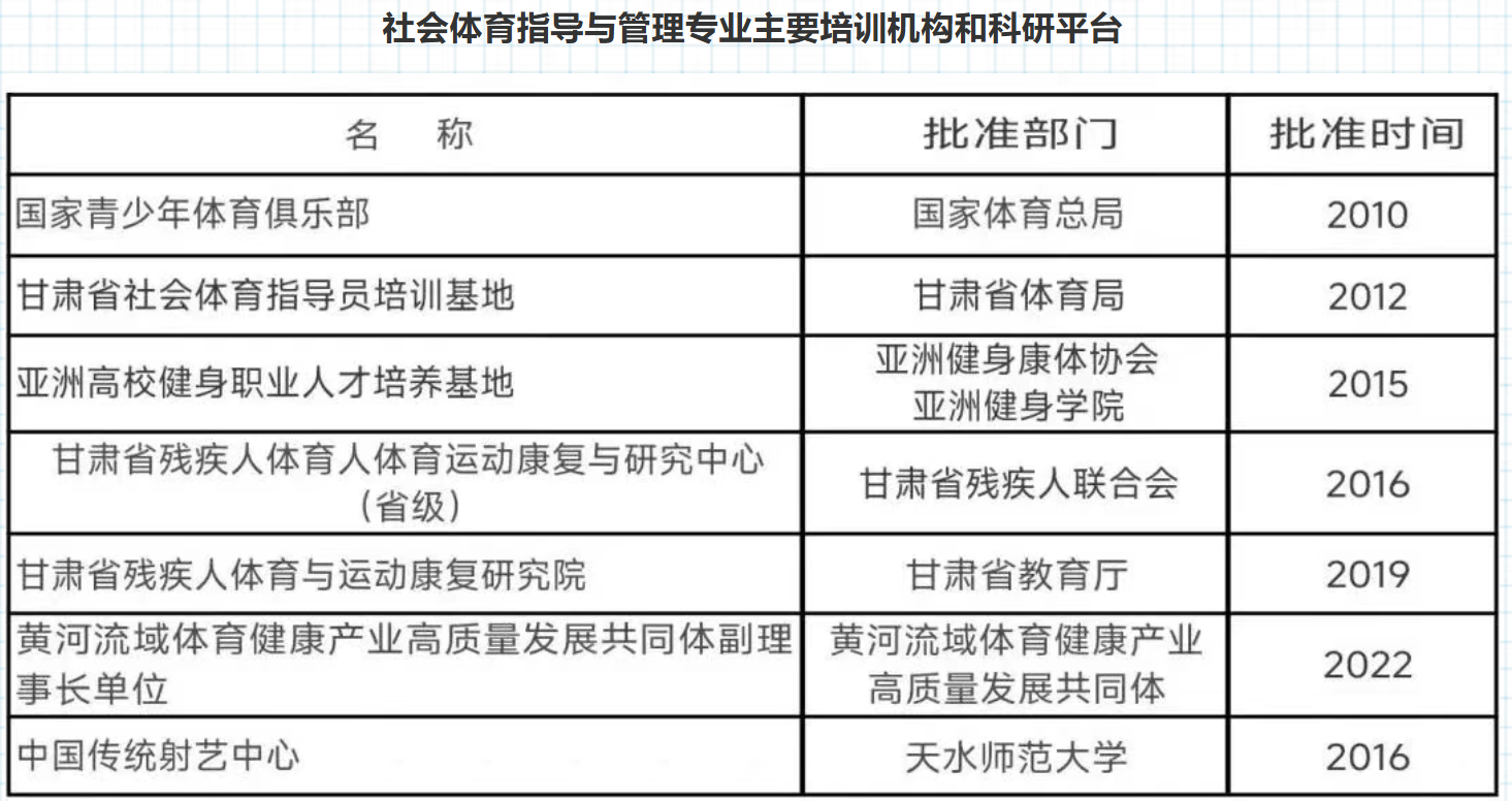 社会体育指导与管理专业依托四大核心平台筑牢实践育人根基:2012年获批的甘肃省社会体育指导员培训基地,长期承担指导员培训、研修与认证,为地方群众体育输送人才;2016年设立的甘肃省残疾人体育与运动康复研究中心,推动专业内容优化,联动多方共享资源,还参与残疾人体育指导员培训,拓宽学生就业路径;2015年授权成立的“亚洲高校健身职业人才培养基地”,引入国际健身教育体系,提升行业影响力;2016年投入300余万元建成的校内实习实训基地,覆盖多实训模块,保障技能与岗位衔接。四大平台协同融合,构建“教学—培训—实训—服务”一体化科教体系,为专业发展提供坚实支撑。