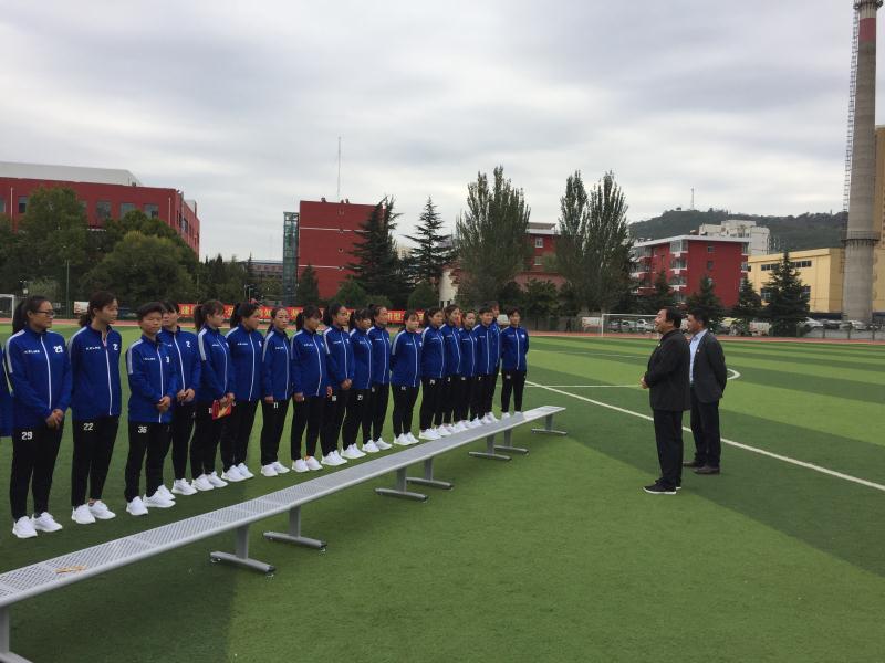 10月11日,副校长、校体委主任安建平为即将参加中华人民共和国第十四届学生运动会足球项目预赛的我校女子足球队作出征动员讲话。